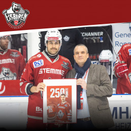 Unser 28-jähriger Offensivverteidiger Jakob Weber hat eine herausragende Marke erreicht: 250 Scorerpunkte für die Eisbären Regensburg. Im Rahmen des Derbys gegen den EV Landshut wurde Jakob von unserem Hauptgesellschafter und Ersten Vorsitzenden der Jungeisbären, Christian Volkmer, für seine Leistungen geehrt.
