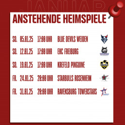Wir haben für euch die Heimspieltermine im Januar parat, und wir zählen auf eure Unterstützung! Ob mit Trikot oder ohne, vom Stehplatz oder Sitzplatz aus – eure Energie ist entscheidend. Unsere Jungs haben sich eine volle Donau-Arena mit 4000 Fans in jedem Heimspiel verdient. Ihr seid der Rückhalt im Kampf um die wichtigen Punkte!