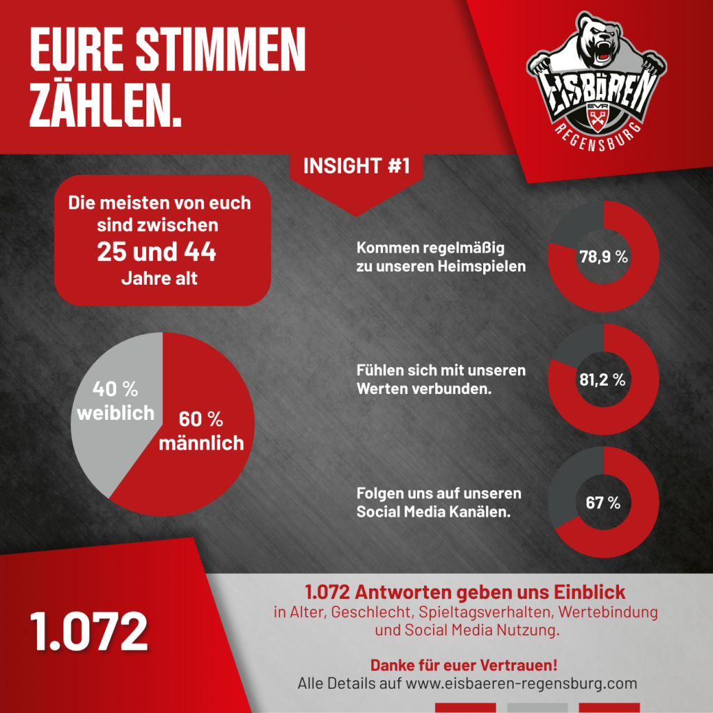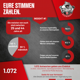 Eure Verbundenheit mit den Eisbären geht weit über den Spieltag hinaus. Ob auf den Rängen im Stadion oder online, ihr seid immer da. Ganze 86,5 % von euch unterstützen die Eisbären auch bei sportlichem Misserfolg und 81,2 % fühlen sich mit unseren Vereinswerten verbunden. Diese Treue ist unsere größte Stärke, aber auch ein Vertrauensvorschuss, den wir pflegen wollen.