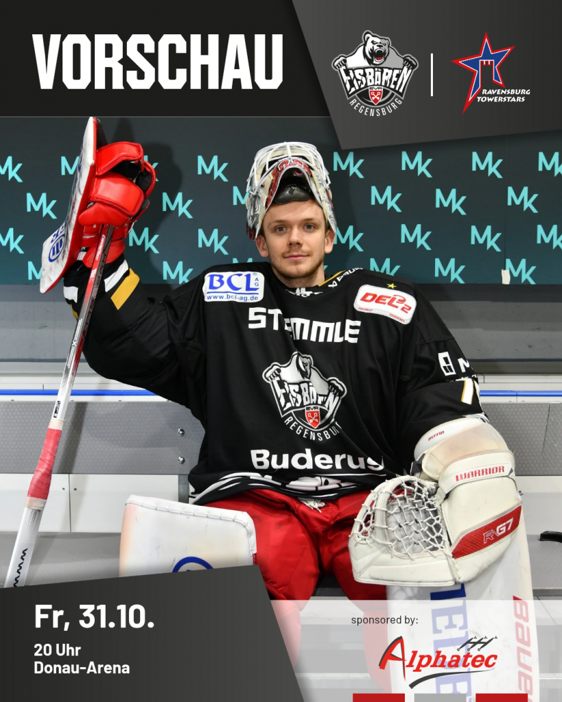 Am letzten DEL-2-Wochenende vor der Länderspielpause (Deutschlands-Cup) stehen für Eishockey-Zweitligist Eisbären Regensburg erneut Duelle gegen zwei in der DEL-2-Tabelle in Schlagdistanz liegende Teams an. Die sechstplatzierten Oberpfälzer (19 Punkte) liegen nach zwei Siegen am vergangenen Wochenende zwei Zähler vor den Ravensburg Towerstars auf Rang neun, die am morgigen Freitagabend, 31. Oktober, ab 20 Uhr in der Donau-Arena gastieren, und drei vor den Lausitzer Füchsen aus Weißwasser auf dem zehnten Platz, zu denen die Donaustädter am Sonntag, 2. November, zum Auswärtsspiel reisen (Beginn in der dortigen Eisarena um 17 Uhr). Im Heimauftritt gegen die Oberschwaben, bei dem Ausrüster Jako Spieltagspartner der Domstädter ist, treten die Schützlinge von Trainer Peter Flache einmalig in ihren von einem Fan im Rahmen eines Designwettbewerbs entworfenen schwarzen Alternativ-Trikots auf, die Wahrzeichen aus Stadt und Region zeigen. Tickets für diese Begegnung gibt es unter www.ebr.live