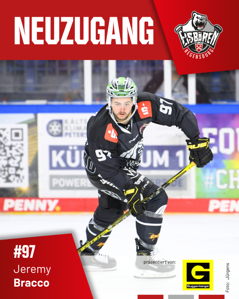 Ein neuer Mann für die Offensive: Die Eisbären Regensburg haben mit Jeremy Bracco einen Kontingentstürmer nachverpflichtet. Der US-Amerikaner kommt aus der ersten Liga der Slowakei zum Eishockey-Zweitligisten und könnte, sofern alle Formalitäten rechtzeitig geklärt sind, bereits am anstehenden Wochenende für die Oberpfälzer auflaufen. Trainer und Sportlicher Leiter Peter Flache berichtet: „Die Verpflichtung wurde notwendig, weil David Morley vorerst verletzt ausfällt und wir bereits mehrere Spiele nur mit drei Imports und ein Wochenende sogar nur mit zweien bestreiten mussten. Deswegen freue ich mich sehr, dass wir Jeremy verpflichten konnten. Ein Spieler, der in der zweiten Runde des NHL-Drafts gezogen wurde – das zeigt klar, welches Talent er mitbringt. Mit 28 Jahren ist er in seiner sportlichen Blüte und bereit, uns sofort weiterzuhelfen.“ Bracco wird die Rückennummer #97 tragen.