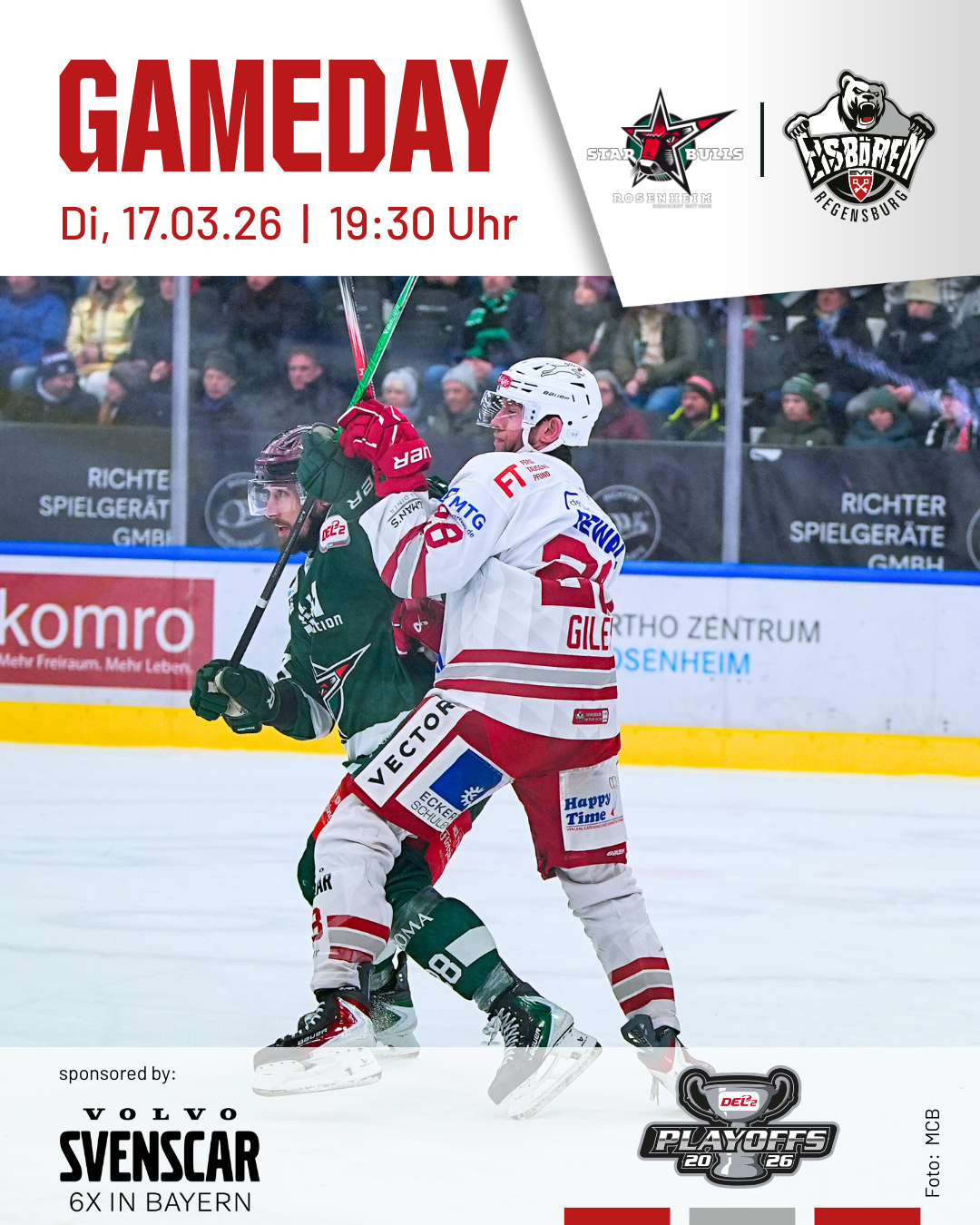 Die Eisbären Regensburg starten in die Viertelfinalserie der DEL2-Endrunde 2025-2026. Gegner im Duell Oberbayern gegen Oberpfalz sind die Starbulls Rosenheim. Spiel 1 steigt im ROFA-Stadion Rosenheim. Intensität. Emotionen. Playoff-Eishockey.