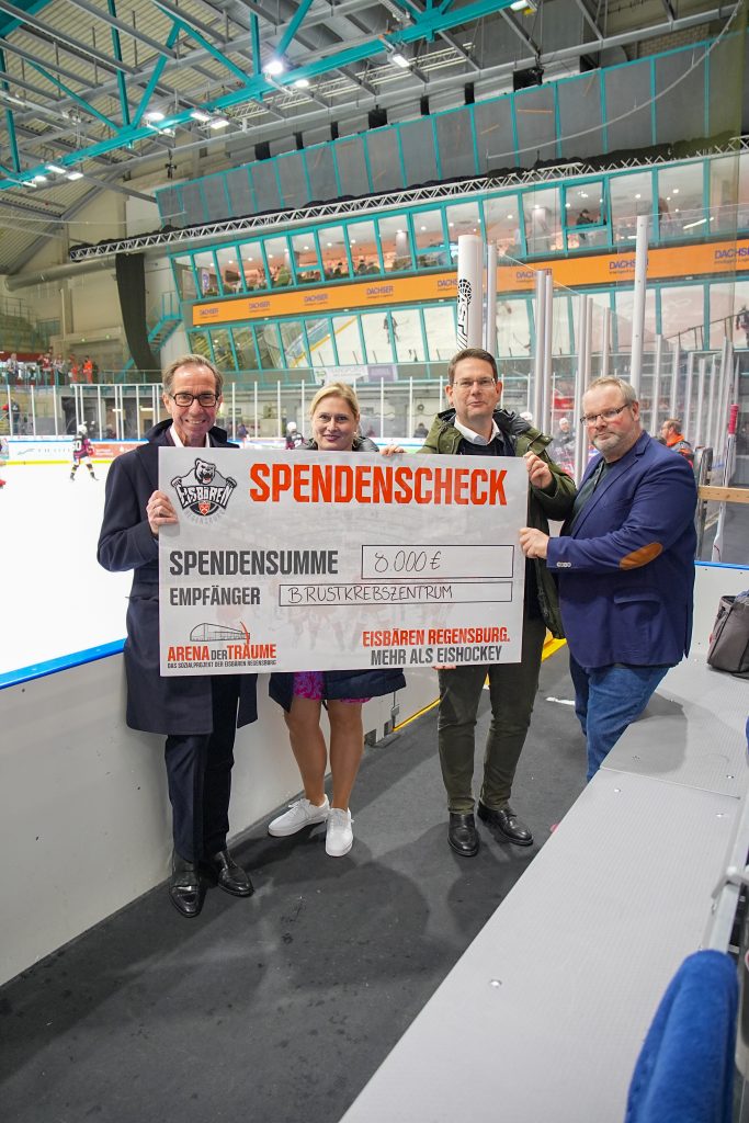 Die offizielle Scheckübergabe fand im Rahmen des Heimspiels am 31. Oktober gegen die Ravensburg Towerstars statt. Eisbären-Kapitän Nikola Gajovský überreichte den Spendenscheck stellvertretend für das gesamte Team und die Fans an Prof. Dr. Sylvia Pemmerl, Geschäftsleitung im Caritas-Krankenhaus St. Josef, sowie an Prof. Dr. Olaf Ortmann, Direktor der Klinik für Frauenheilkunde und Geburtshilfe der Universität Regensburg am Caritas-Krankenhaus St. Josef und Leiter des Brustkrebszentrums.